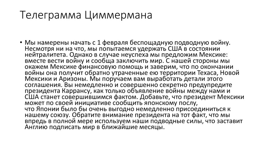 Телеграмма Циммермана• Мы намерены начать с 1 февраля беспощадную подводную войну.