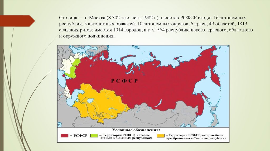 Столица — г. Москва (8 302 тыс. чел., 1982 г.). в состав РСФСР входят 16 автономныхреспублик, 5 автономных областей, 10 автономных округов, 6 краев, 49 областей, 1813