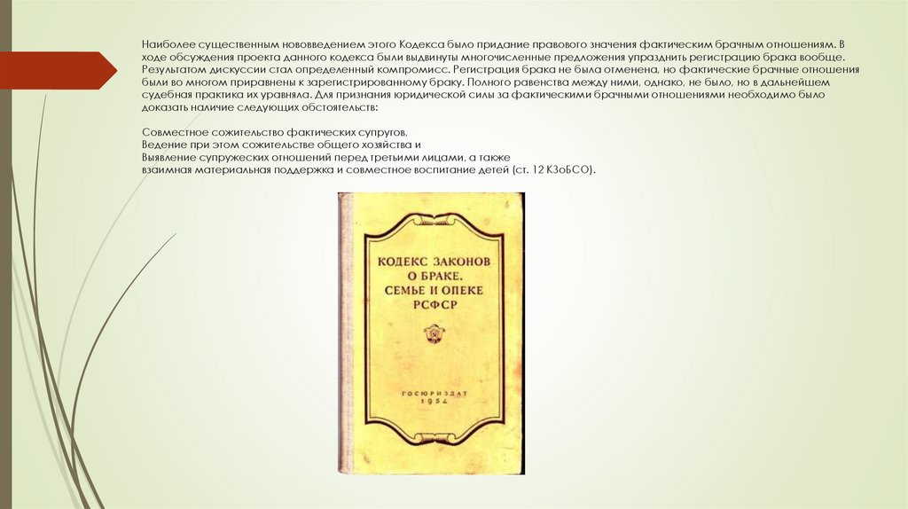 Наиболее существенным нововведением этого Кодекса было придание правового значения фактическим брачным отношениям. Входе обсуждения проекта данного кодекса были выдвинуты многочисленные предложения упразднить регистрацию брака вообще.