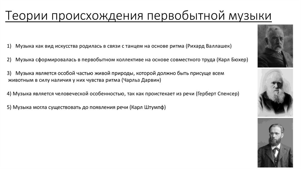 Теории происхождения первобытной музыки1) Музыка как вид искусства родилась в связи с танцем на основе ритма (Рихард Валлашек)