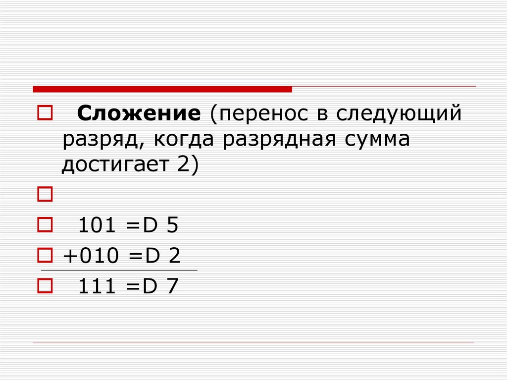 Кодирование. Сложение (перенос в следующий разряд, когда разрядная сумма достигает 2)