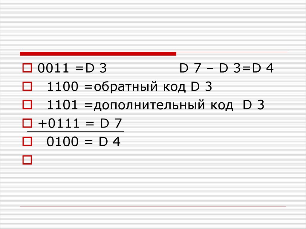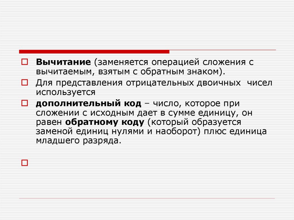 Вычитание (заменяется операцией сложения свычитаемым, взятым с обратным знаком).