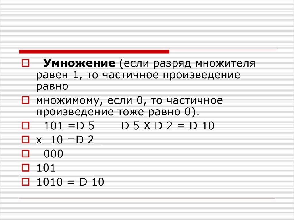 Умножение (если разряд множителяравен 1, то частичное произведение