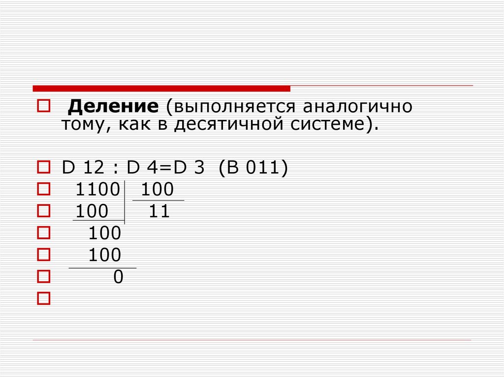 Деление (выполняется аналогичнотому, как в десятичной системе).