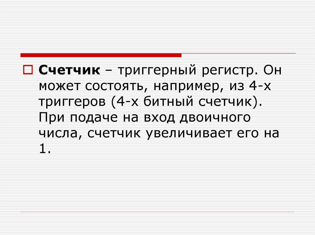 Счетчик – триггерный регистр. Онможет состоять, например, из 4-х