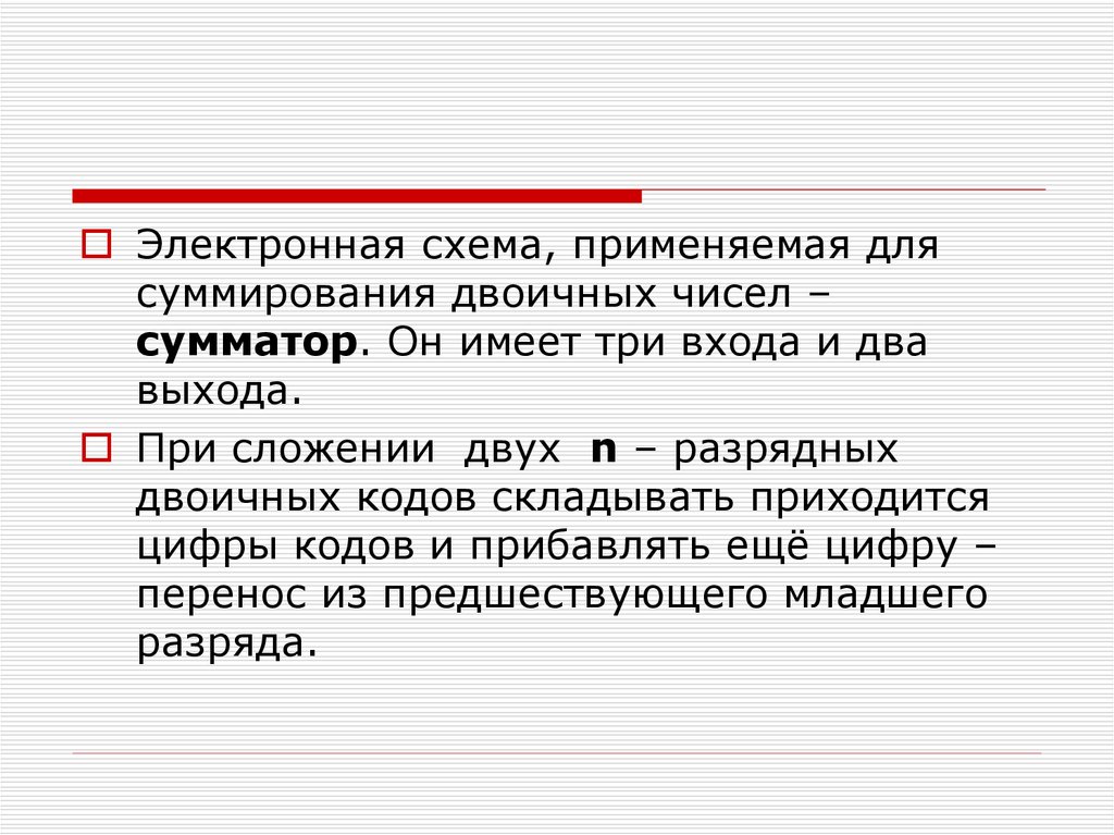 Электронная схема, применяемая длясуммирования двоичных чисел –