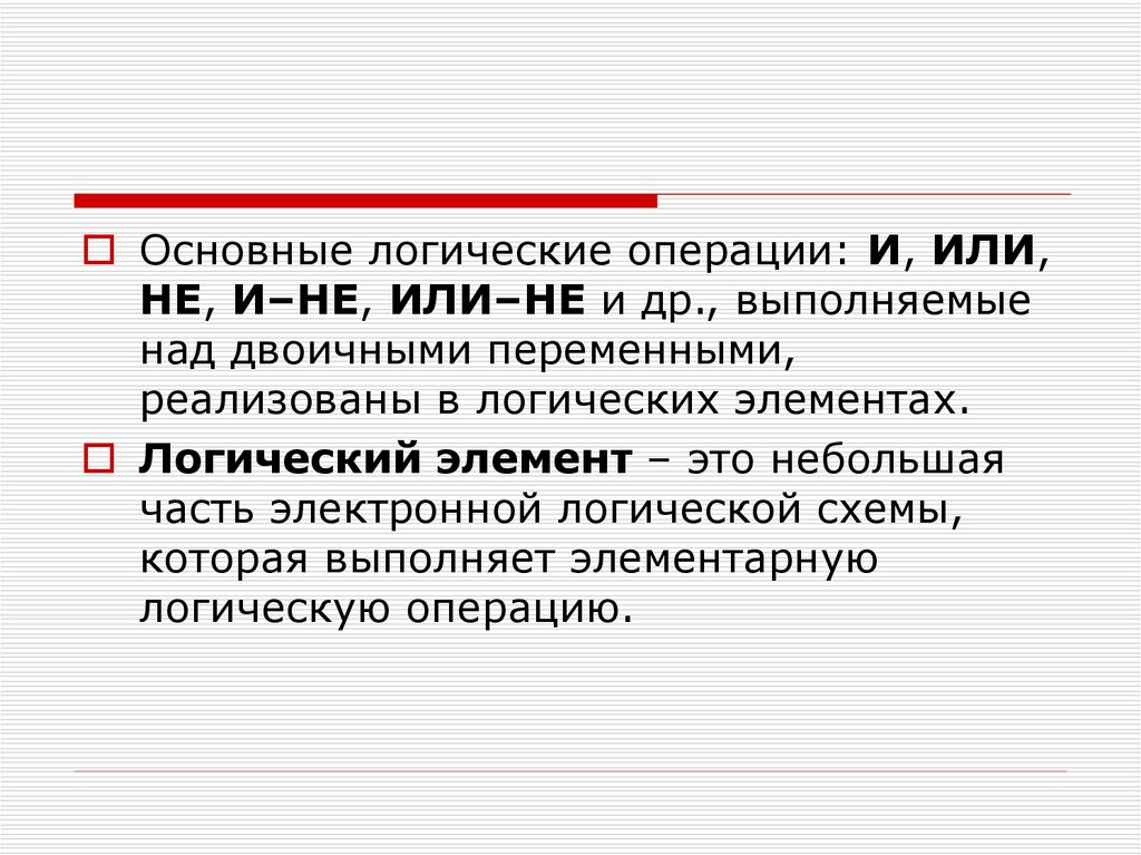 Основные логические операции: И, ИЛИ,НЕ, И–НЕ, ИЛИ–НЕ и др., выполняемые