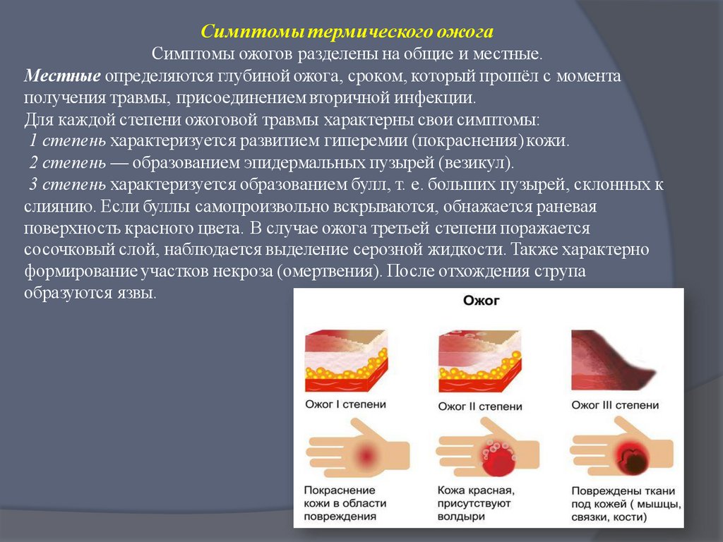 Для каждой степени ожоговой травмы характерны свои симптомы: