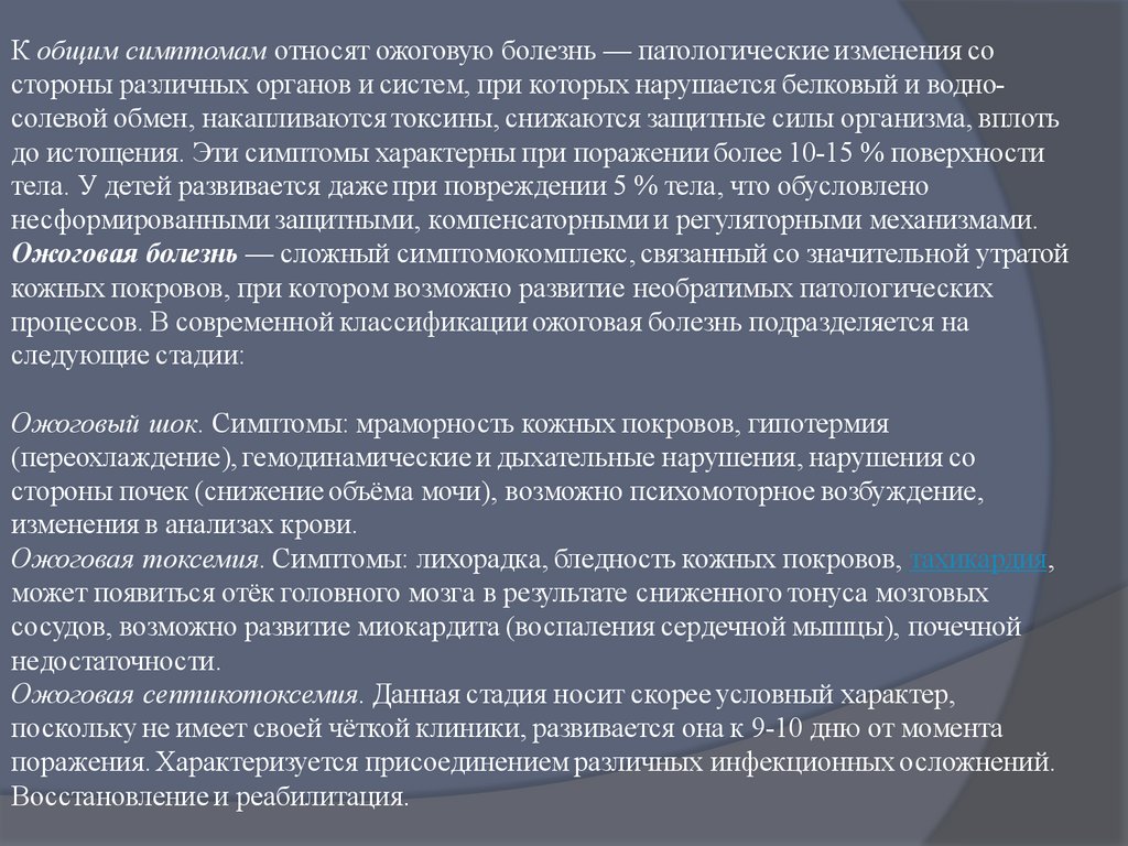 К общим симптомам относят ожоговую болезнь — патологические изменения состороны различных органов и систем, при которых нарушается белковый и водносолевой обмен, накапливаются токсины, снижаются защитные силы организма, вплоть