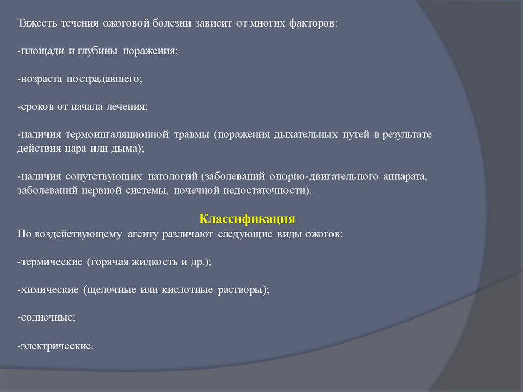 Тяжесть течения ожоговой болезни зависит от многих факторов:-площади и глубины поражения;