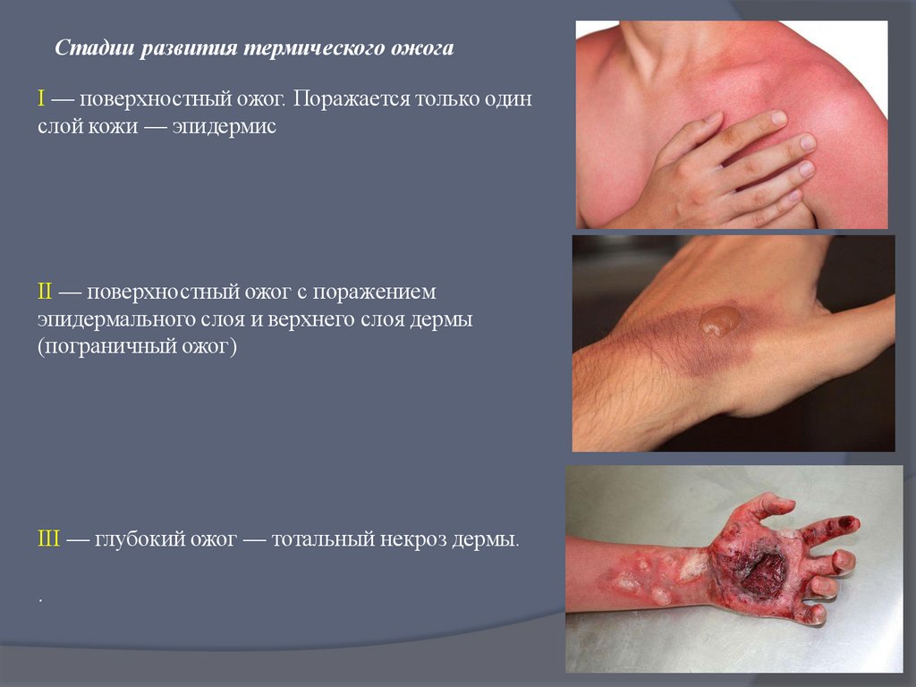 Стадии развития термического ожогаI — поверхностный ожог. Поражается только один