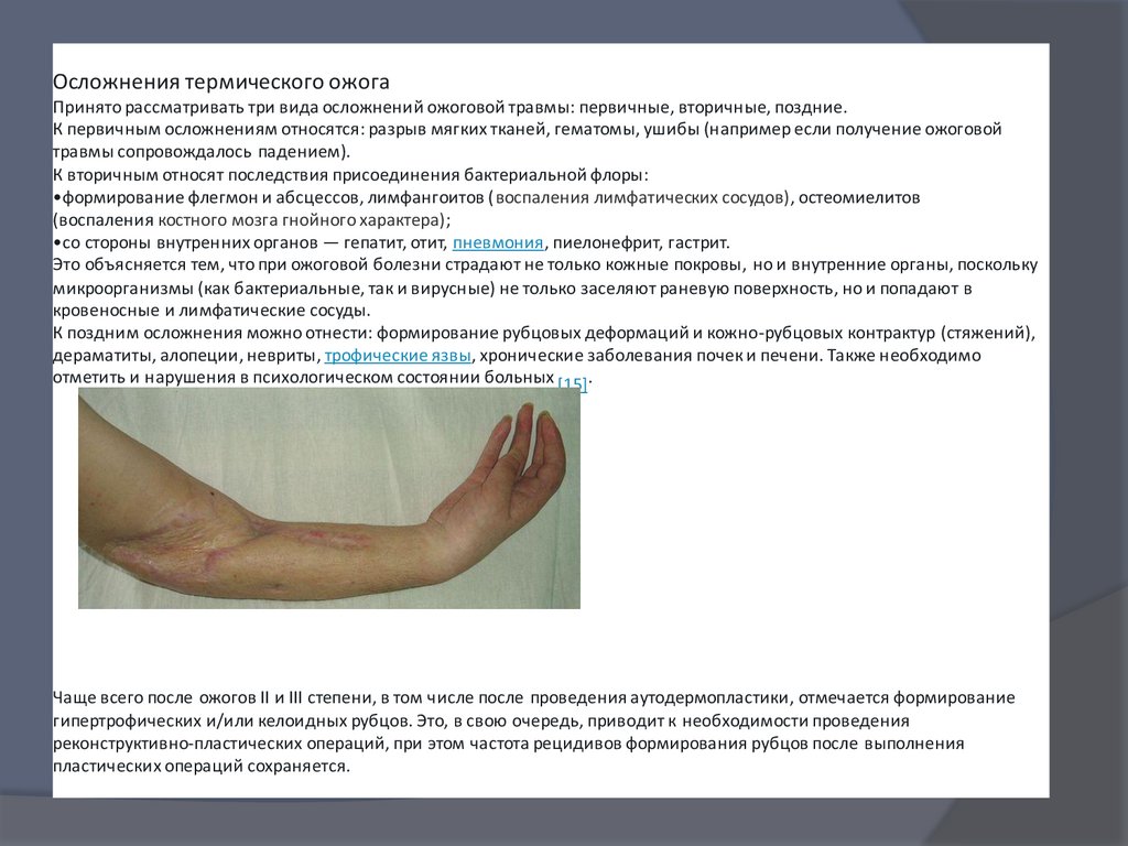 К поздним осложнения можно отнести: формирование рубцовых деформаций и кожно-рубцовых контрактур (стяжений),