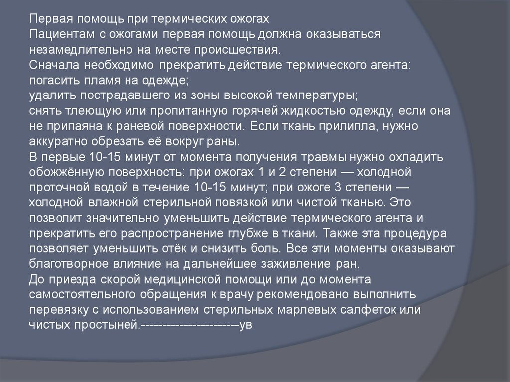 Первая помощь при термических ожогахПациентам с ожогами первая помощь должна оказываться
