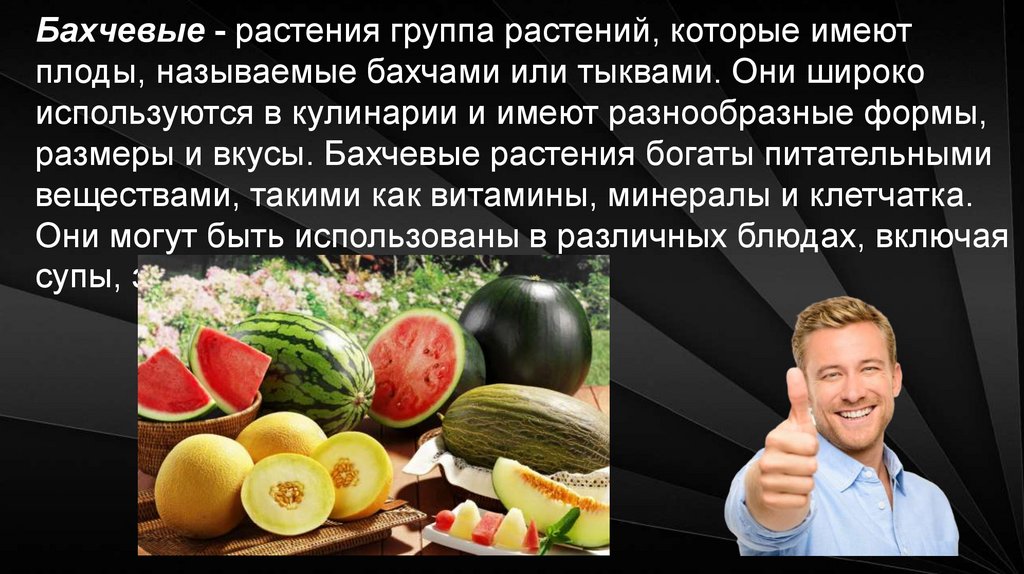 Бахчевые - растения группа растений, которые имеютплоды, называемые бахчами или тыквами. Они широко