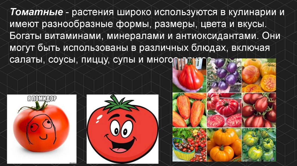 Томатные - растения широко используются в кулинарии иимеют разнообразные формы, размеры, цвета и вкусы.