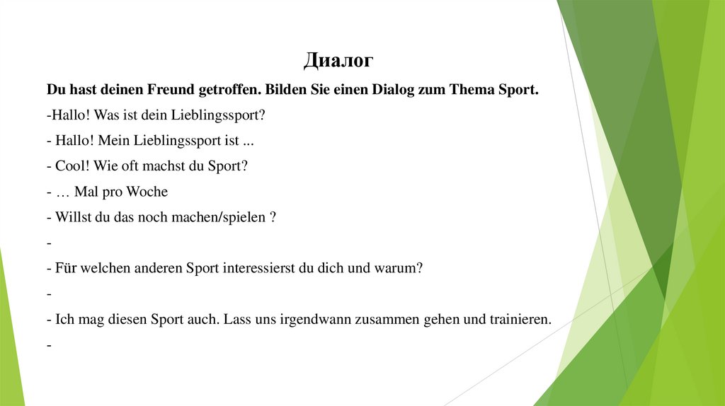 ДиалогDu hast deinen Freund getroffen. Bilden Sie einen Dialog zum Thema Sport.