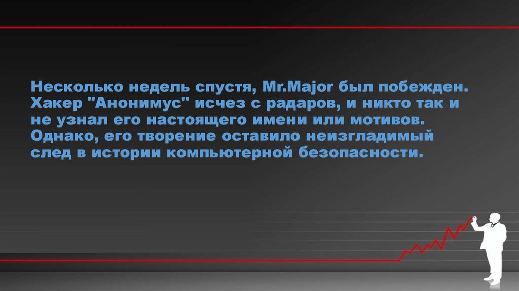 Несколько недель спустя, Mr.Major был побежден.Хакер "Анонимус" исчез с радаров, и никто так и