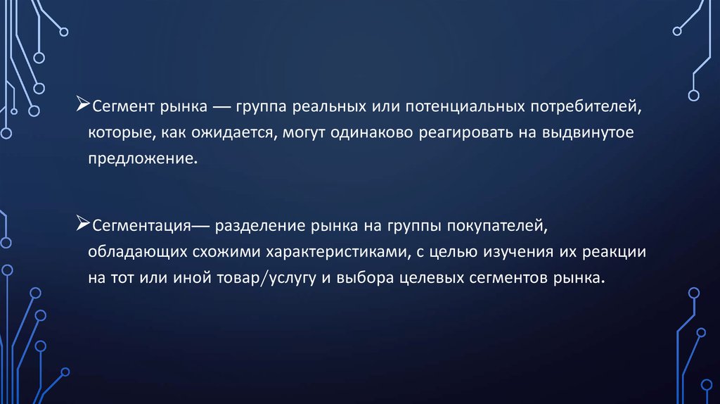 Сегмент рынка — группа реальных или потенциальных потребителей,которые, как ожидается, могут одинаково реагировать на выдвинутое