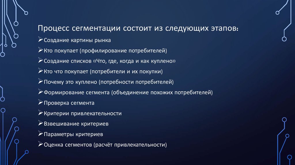 Процесс сегментации состоит из следующих этапов:Создание картины рынка
