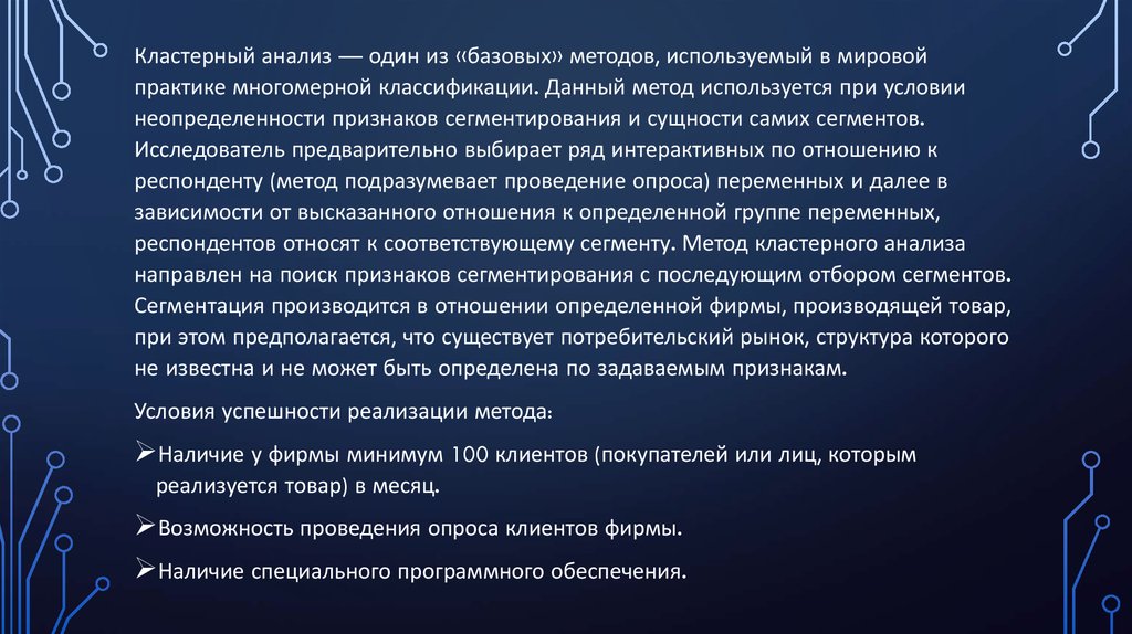 Кластерный анализ — один из «базовых» методов, используемый в мировойпрактике многомерной классификации. Данный метод используется при условии