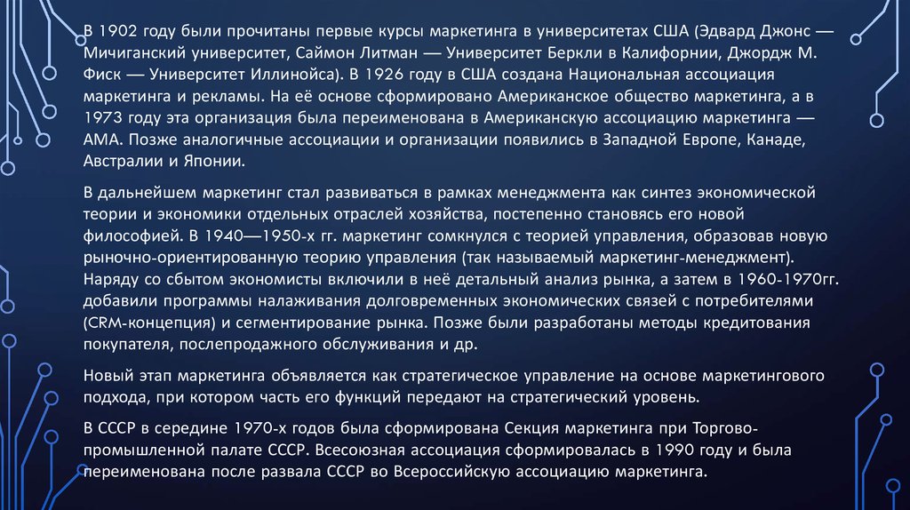 В 1902 году были прочитаны первые курсы маркетинга в университетах США (Эдвард Джонс —Мичиганский университет, Саймон Литман — Университет Беркли в Калифорнии, Джордж М.