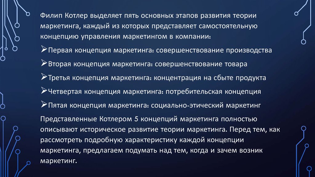 Филип Котлер выделяет пять основных этапов развития теориимаркетинга, каждый из которых представляет самостоятельную