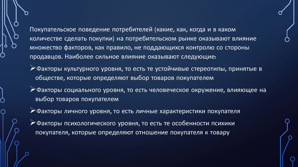 Покупательское поведение потребителей (какие, как, когда и в какомколичестве сделать покупки) на потребительском рынке оказывают влияние