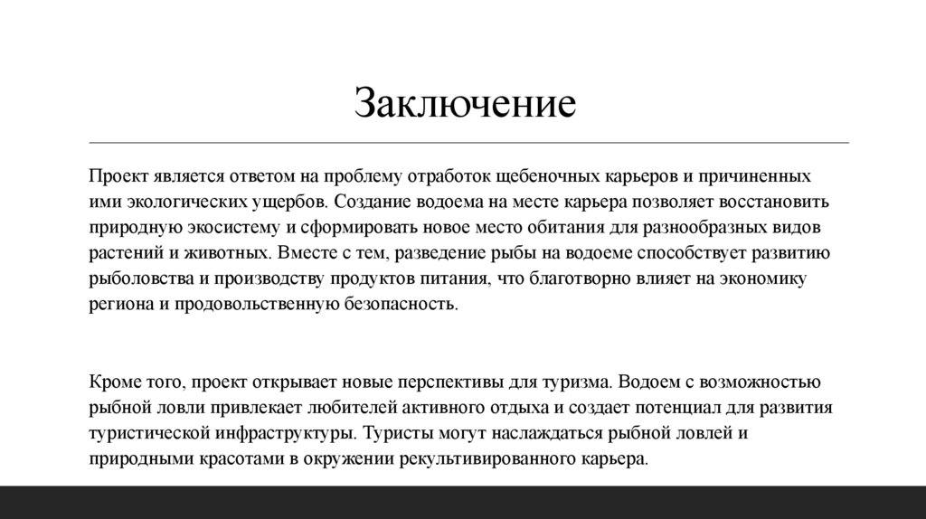 ЗаключениеПроект является ответом на проблему отработок щебеночных карьеров и причиненных