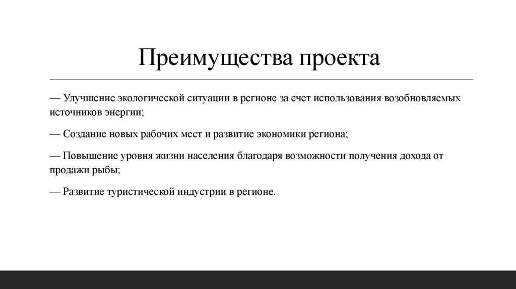Преимущества проекта— Улучшение экологической ситуации в регионе за счет использования возобновляемых