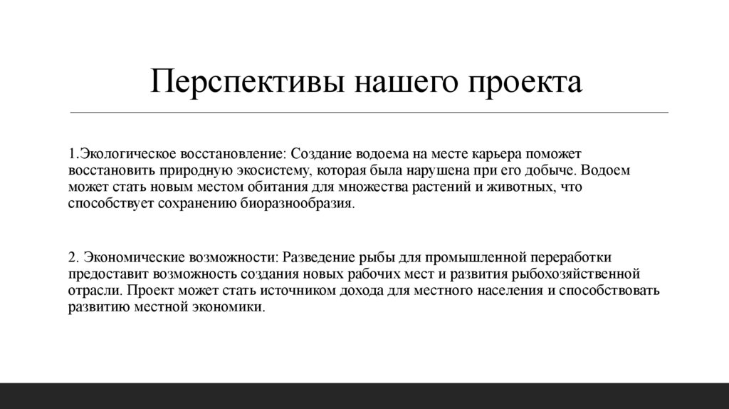 Перспективы нашего проекта1.Экологическое восстановление: Создание водоема на месте карьера поможет