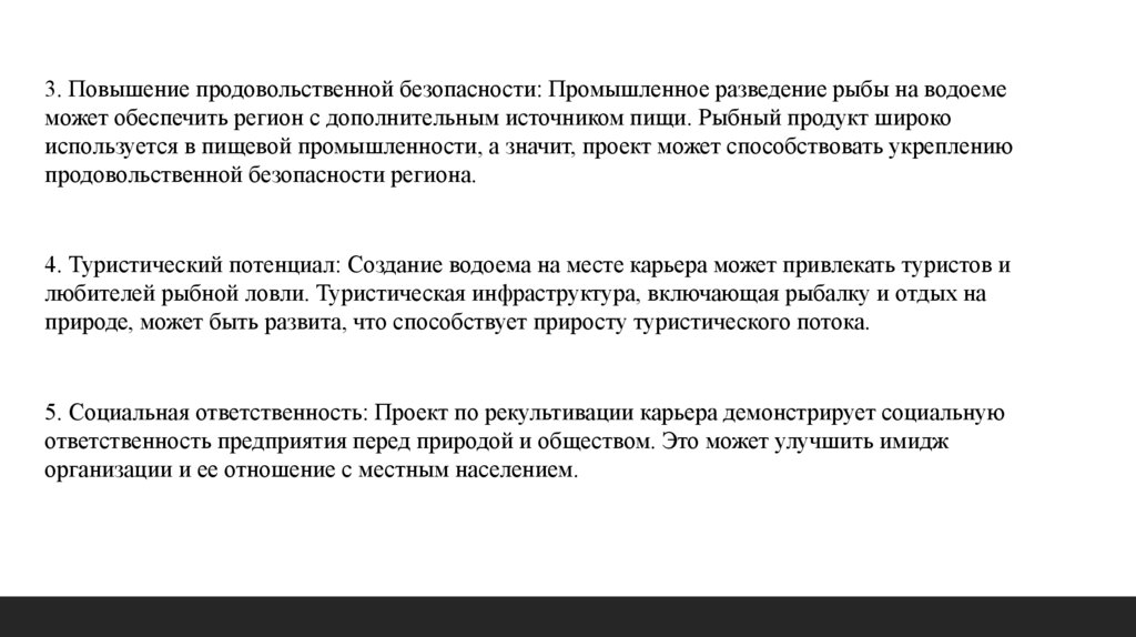 3. Повышение продовольственной безопасности: Промышленное разведение рыбы на водоемеможет обеспечить регион с дополнительным источником пищи. Рыбный продукт широко