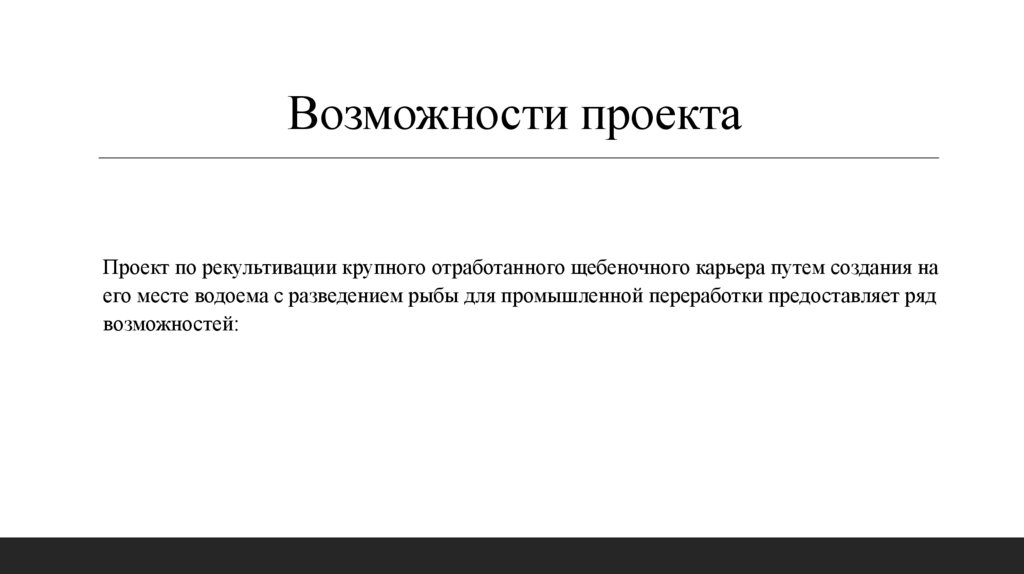 Возможности проектаПроект по рекультивации крупного отработанного щебеночного карьера путем создания на