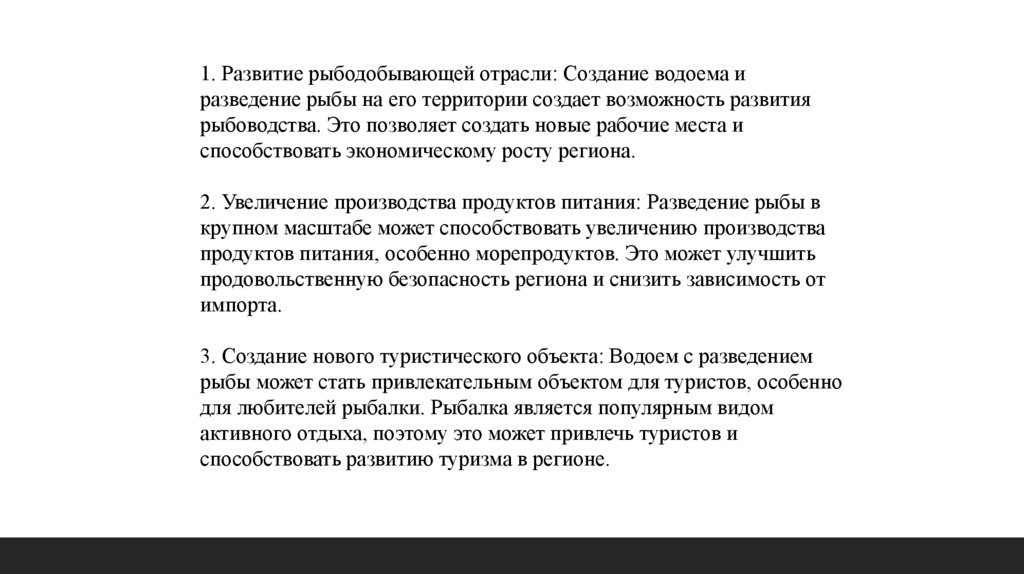 1. Развитие рыбодобывающей отрасли: Создание водоема иразведение рыбы на его территории создает возможность развития