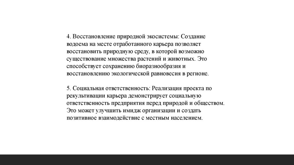 4. Восстановление природной экосистемы: Созданиеводоема на месте отработанного карьера позволяет