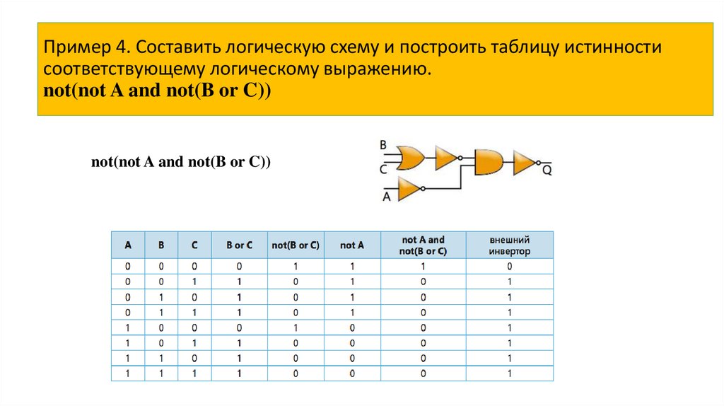 Пример 4. Составить логическую схему и построить таблицу истинностисоответствующему логическому выражению.