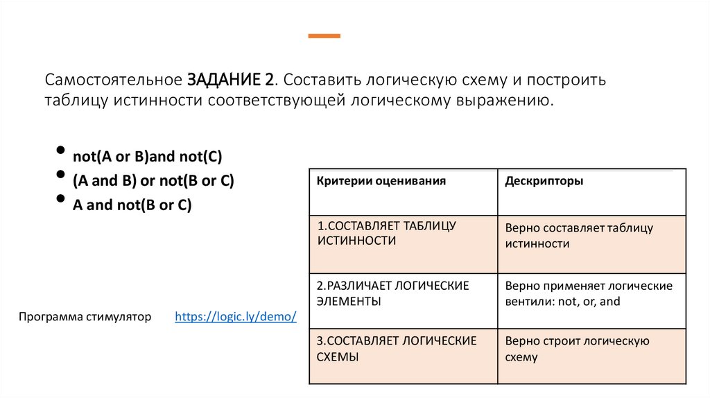Самостоятельное ЗАДАНИЕ 2. Составить логическую схему и построитьтаблицу истинности соответствующей логическому выражению.