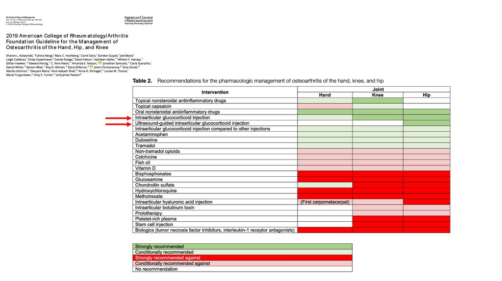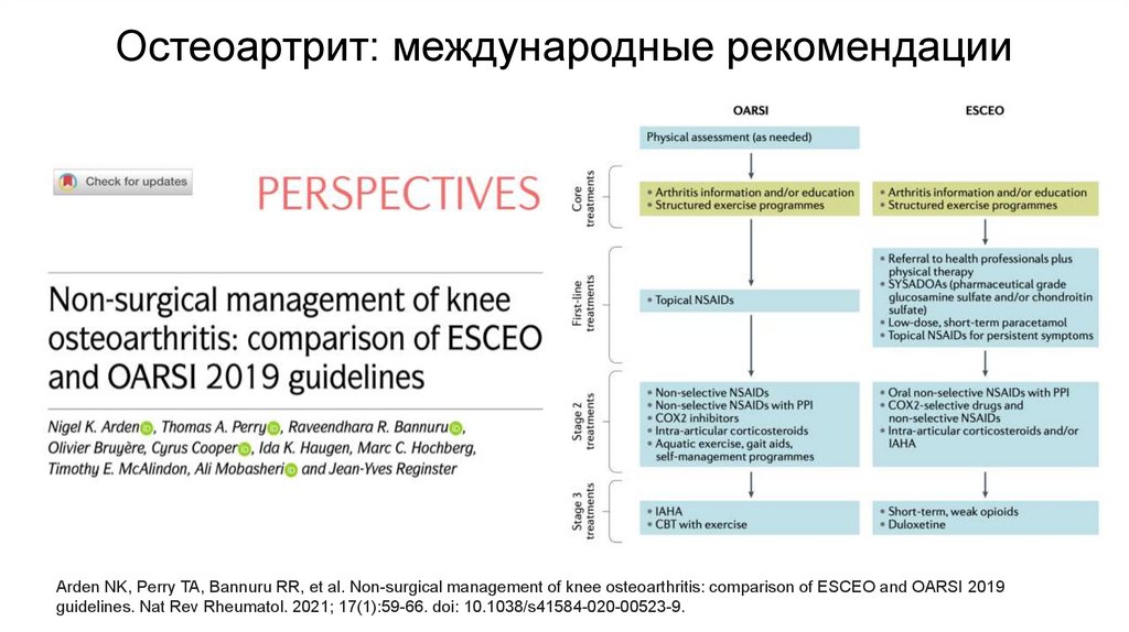 Остеоартрит: международные рекомендацииArden NK, Perry TA, Bannuru RR, et al. Non-surgical management of knee osteoarthritis: comparison of ESCEO and OARSI 2019