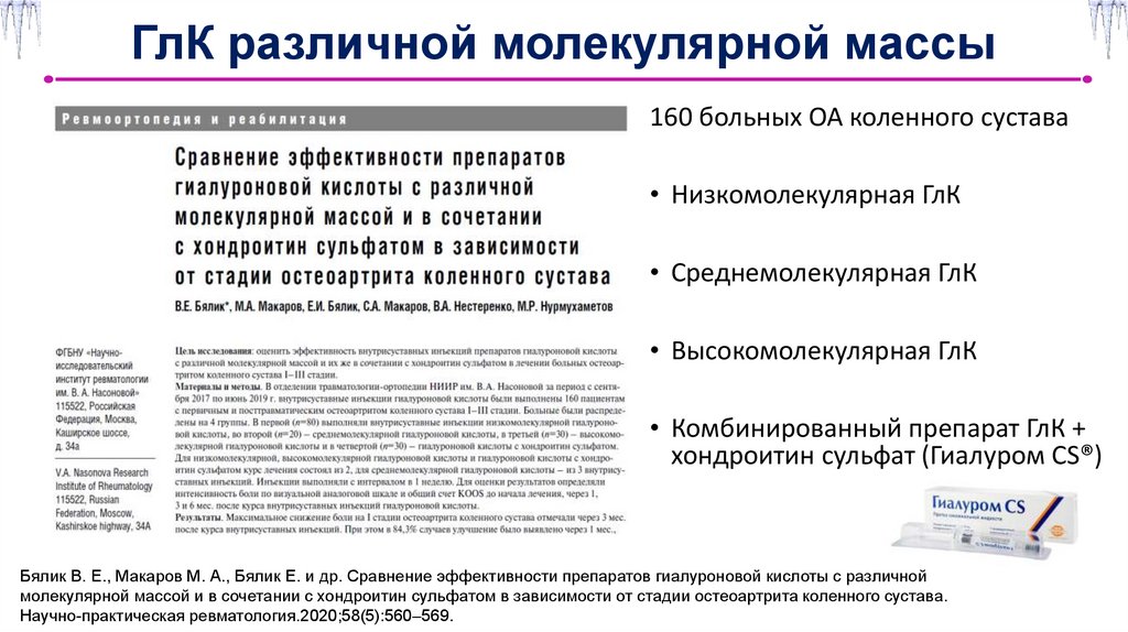 Бялик В. Е., Макаров М. А., Бялик Е. и др. Сравнение эффективности препаратов гиалуроновой кислоты с различной