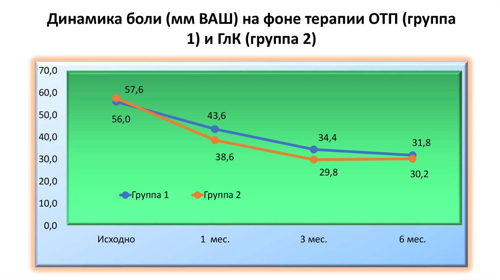 Динамика боли (мм ВАШ) на фоне терапии ОТП (группа1) и ГлК (группа 2)