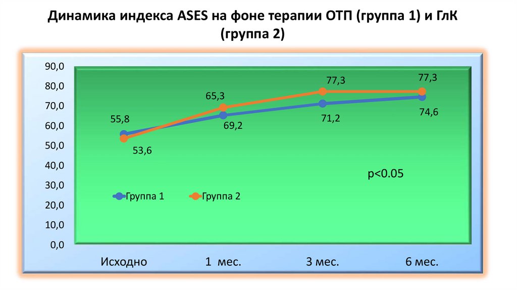 Динамика индекса ASES на фоне терапии ОТП (группа 1) и ГлК(группа 2)