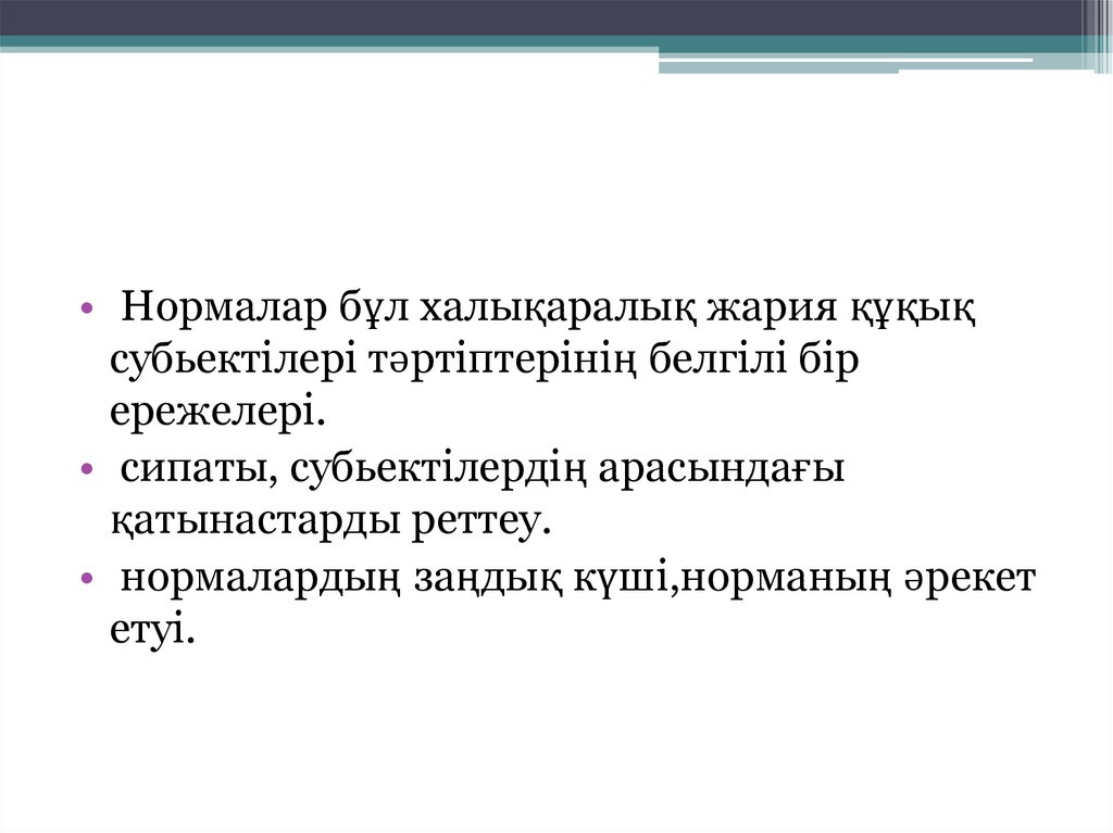 • Нормалар бұл халықаралық жария құқықсубьектілері тәртіптерінің белгілі бір