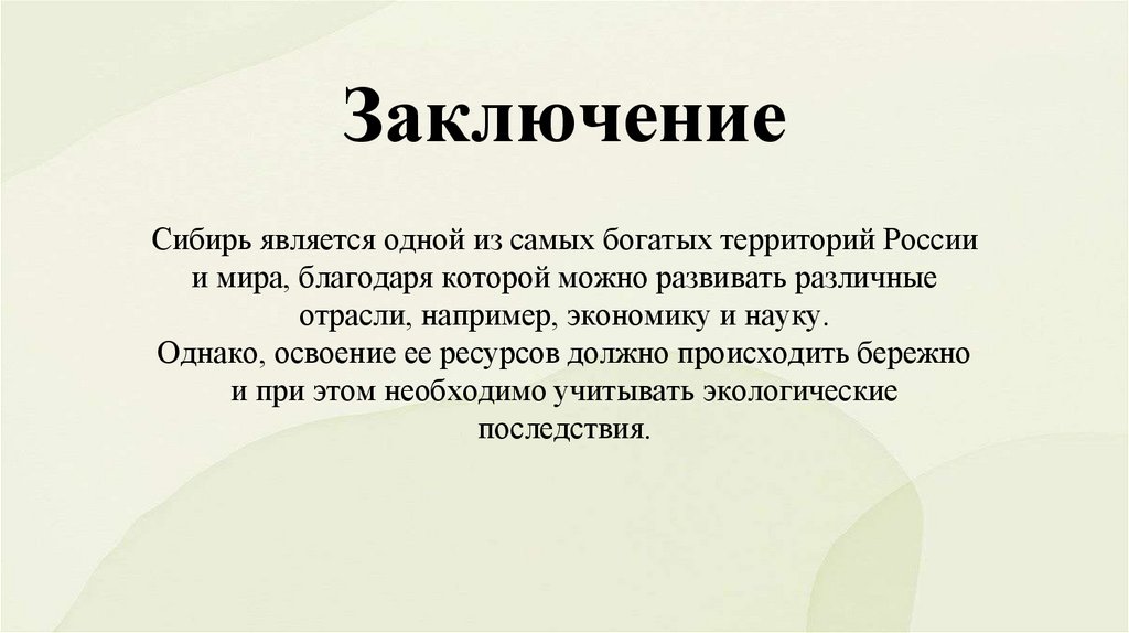 ЗаключениеСибирь является одной из самых богатых территорий России