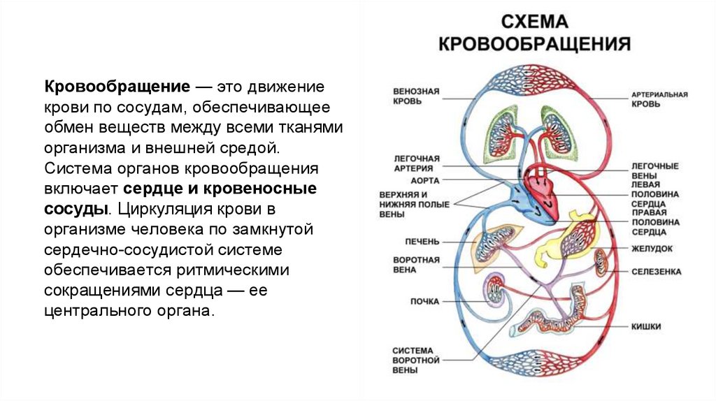 Кровообращение — это движениекрови по сосудам, обеспечивающее