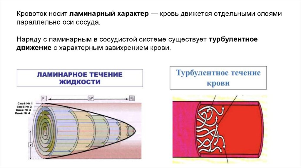 Кровоток носит ламинарный характер — кровь движется отдельными слоямипараллельно оси сосуда.