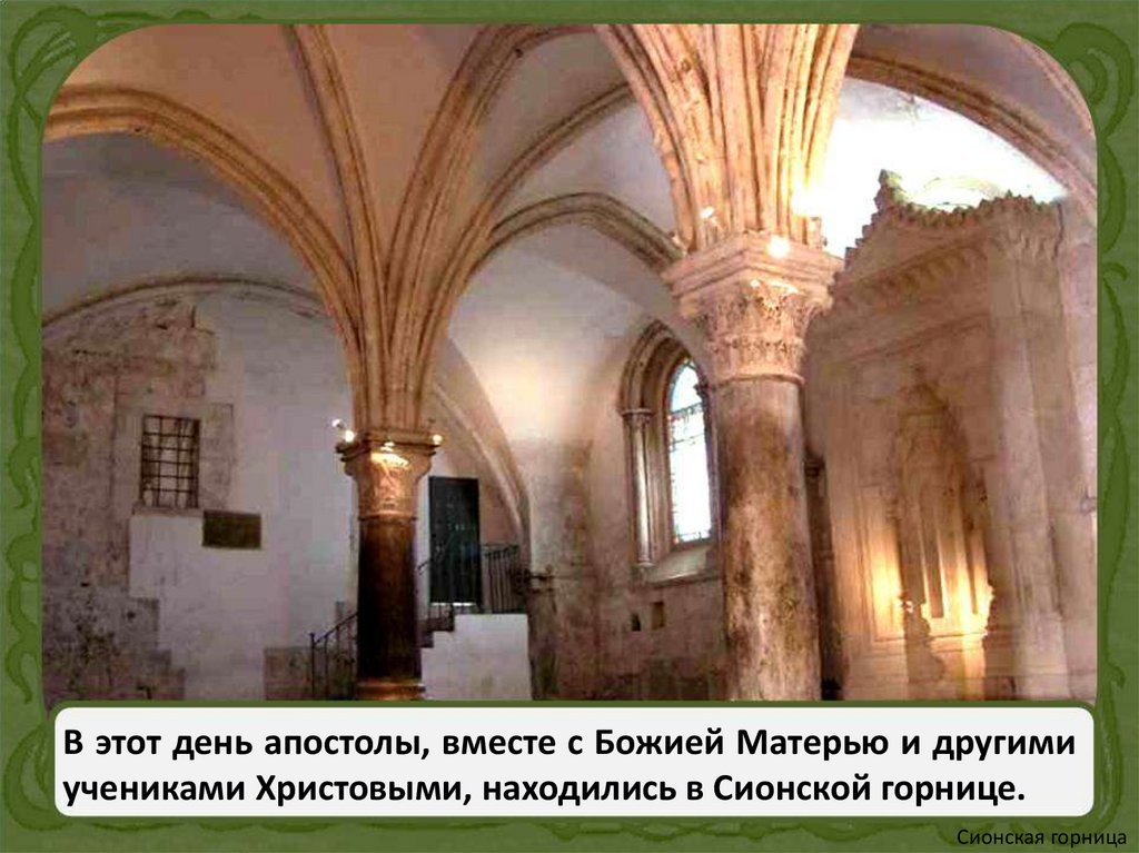 В этот день апостолы, вместе с Божией Матерью и другимиучениками Христовыми, находились в Сионской горнице.