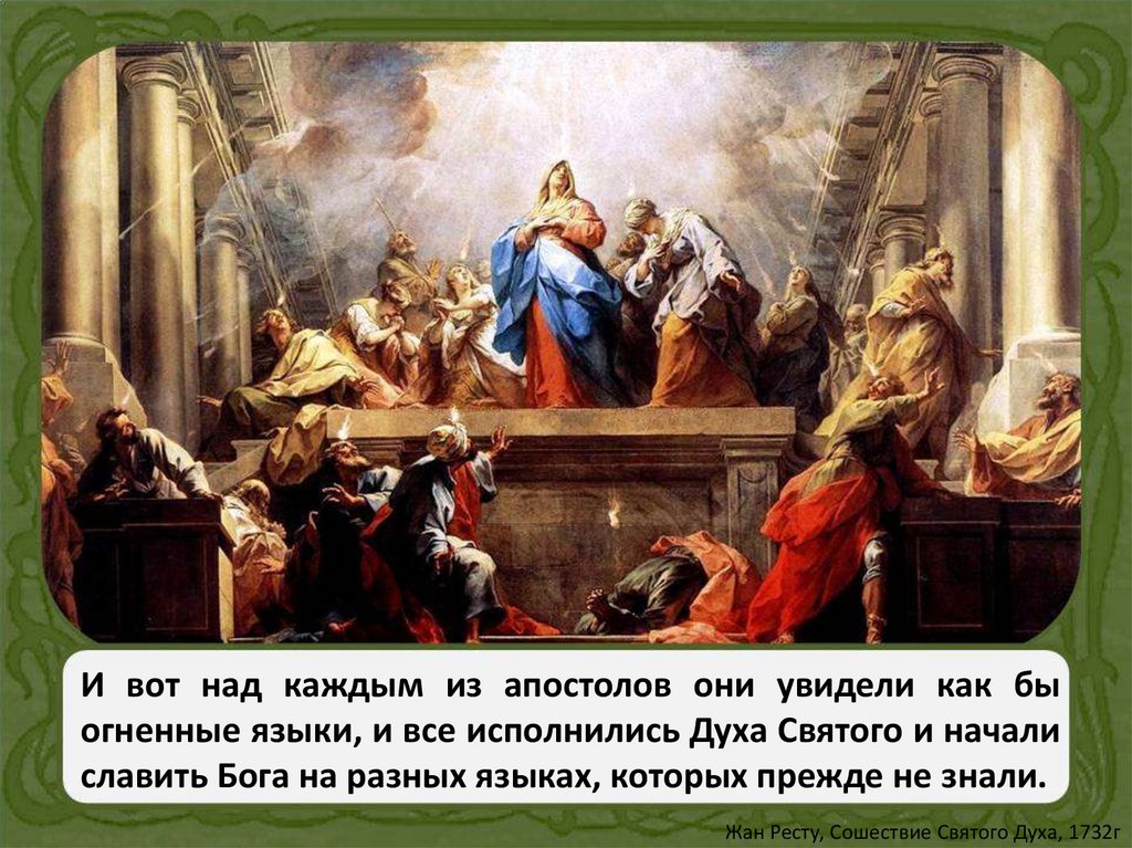 И вот над каждым из апостолов они увидели как быогненные языки, и все исполнились Духа Святого и начали