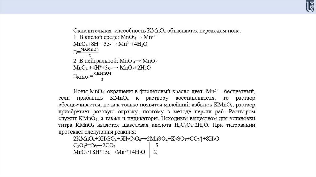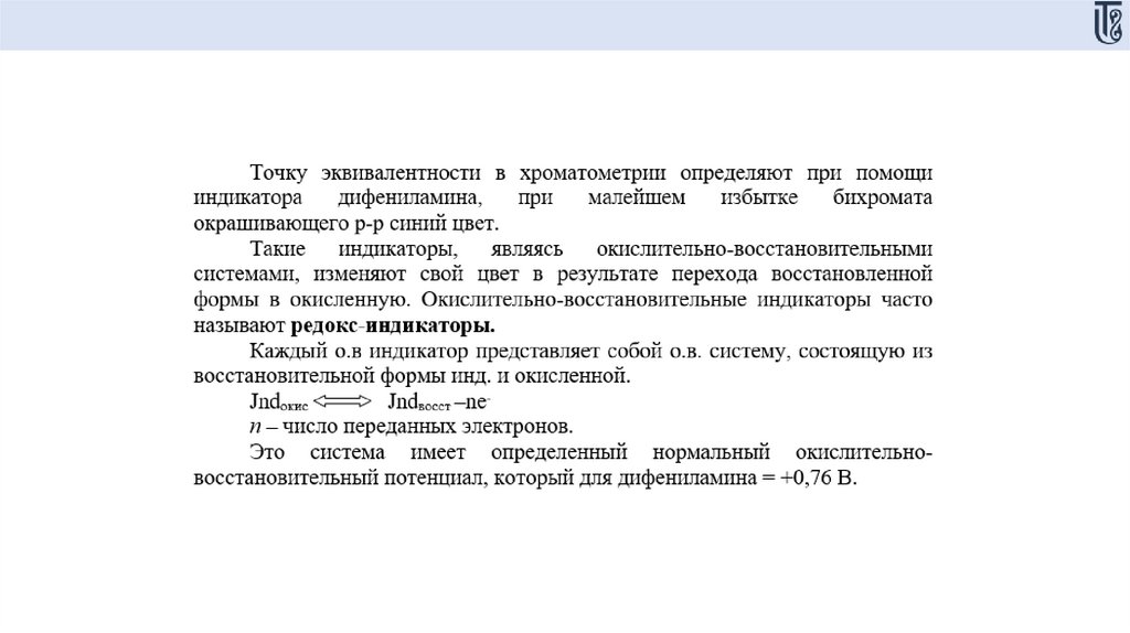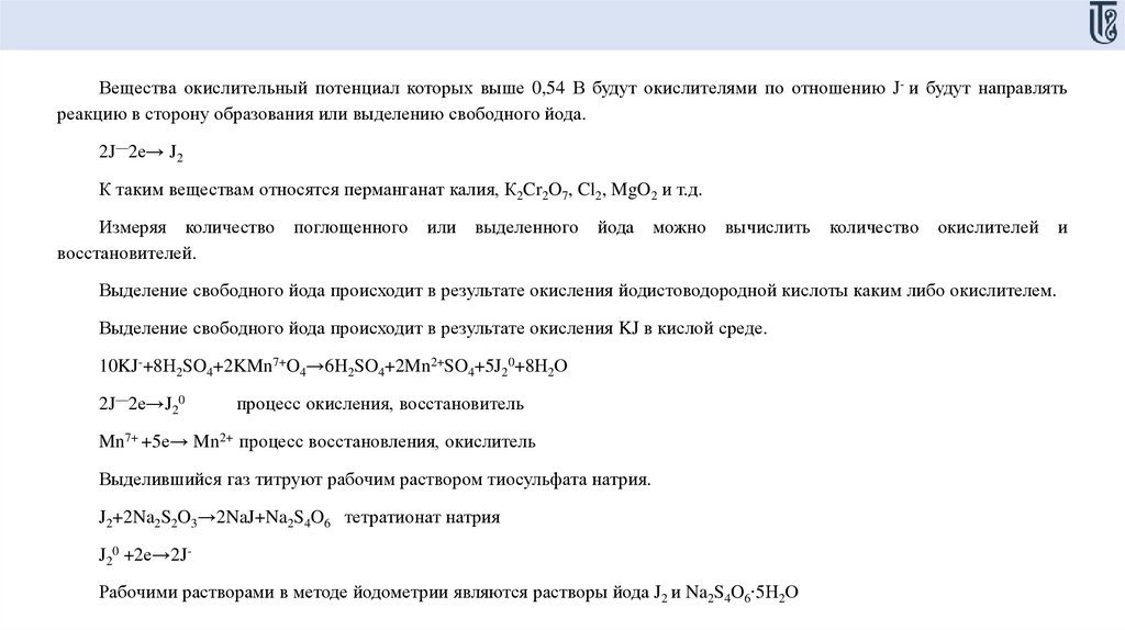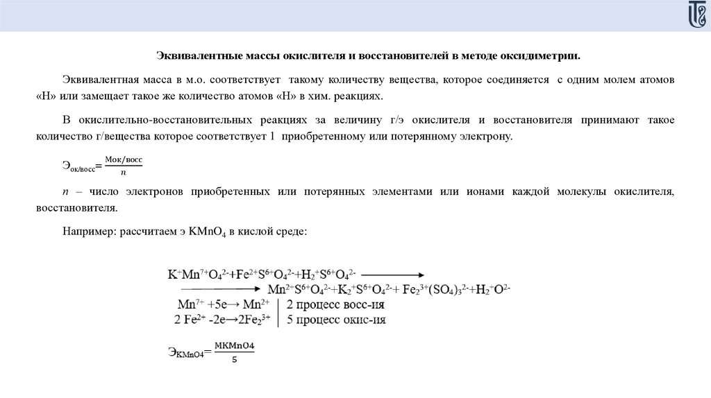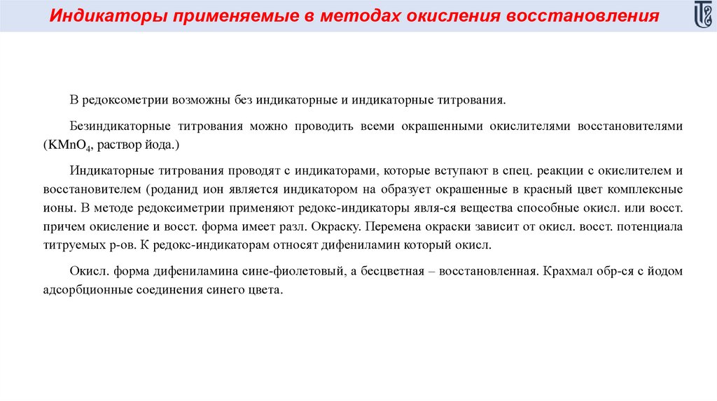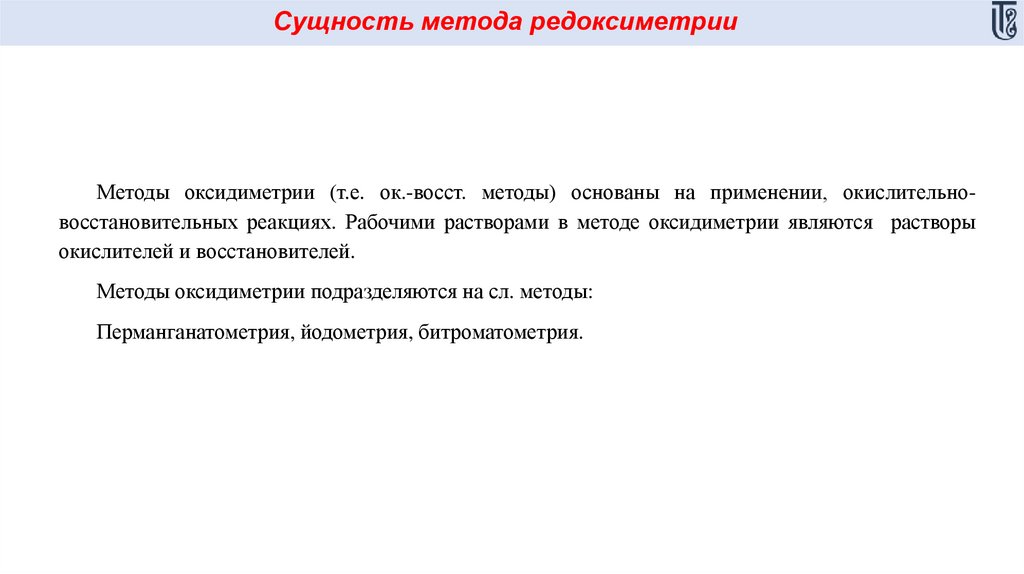 Сущность метода редоксиметрииМетоды оксидиметрии (т.е. ок.-восст. методы) основаны на применении, окислительновосстановительных реакциях. Рабочими растворами в методе оксидиметрии являются растворы