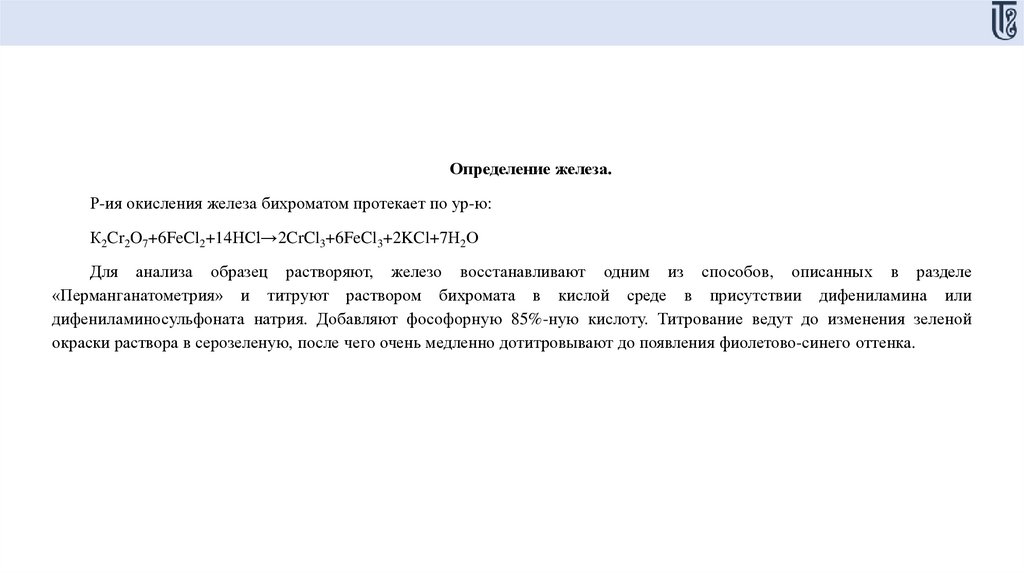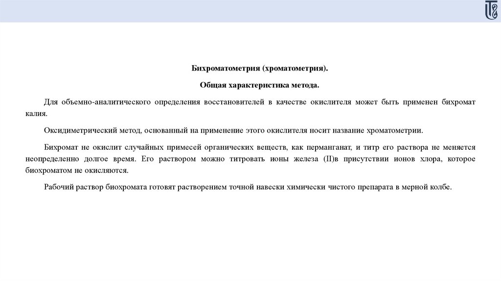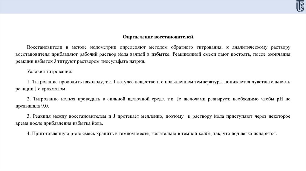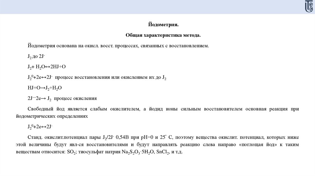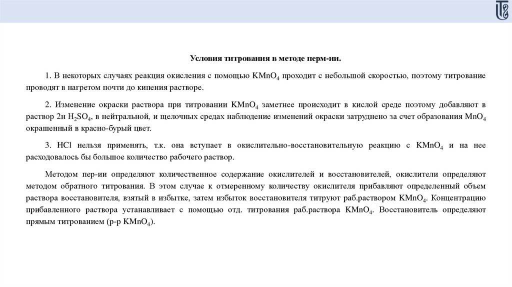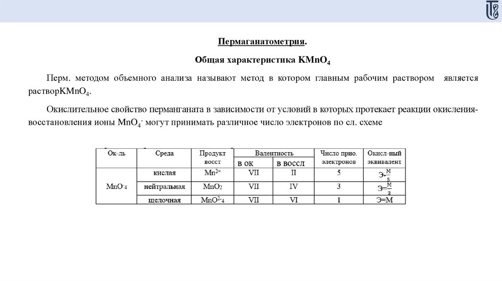 Сущность метода редоксиметрииМетоды оксидиметрии (т.е. ок.-восст. методы) основаны на применении, окислительновосстановительных реакциях. Рабочими растворами в методе оксидиметрии являются растворы