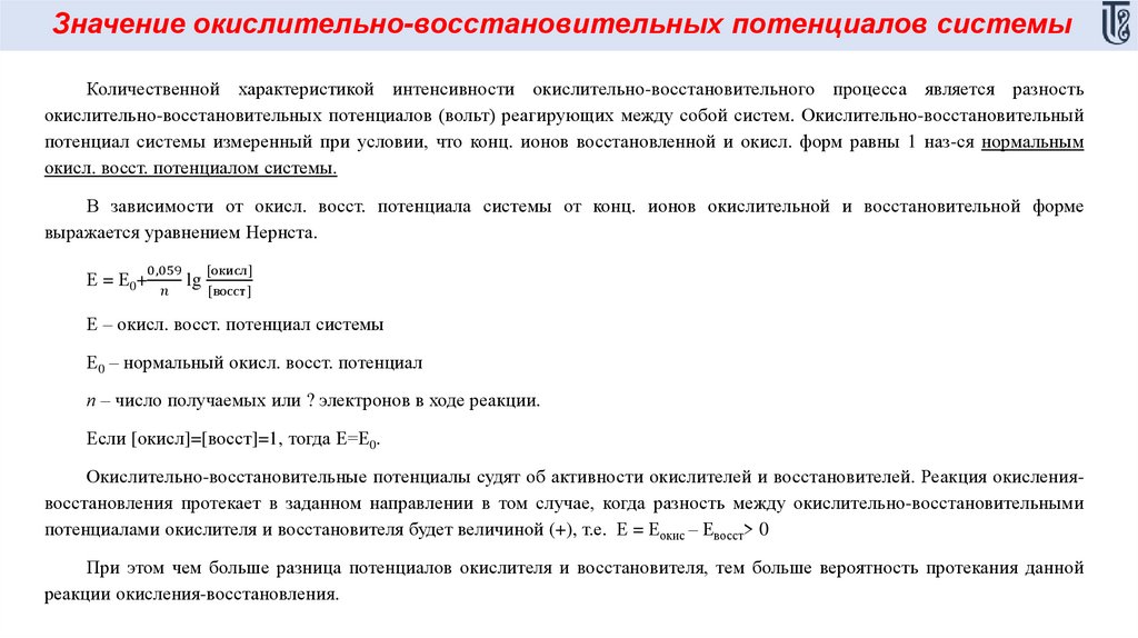 Значение окислительно-восстановительных потенциалов системыКоличественной характеристикой интенсивности окислительно-восстановительного процесса является разность