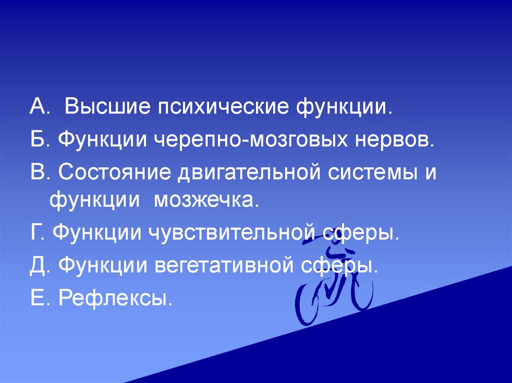 А. Высшие психические функции.Б. Функции черепно-мозговых нервов.